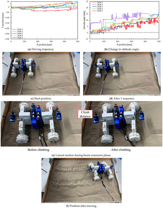 First, it is expected that modifying the recovery displacement and operation sequence during beam extension and contraction will allow the rover to return to its pre-sideslip attitude. Additionally, a redesign of the beam mechanism is needed. One identified cause of unintended increases in attitude angle is the sliding section at the center of the chassis. In future designs, mechanically linking the split center section of the rover could simplify the lateral motion by allowing simultaneous lifting of the front and rear axles. This may eliminate the need for sequential lifting steps, thereby reducing the time and complexity of the recovery motion. This redesign would also reduce that number of motion phases, thereby shortening the overall operation time. Next, experimental results showed that the amount of sinkage during lateral movement was greater than the actual lateral displacement. In other words, beam extension and contraction caused the wheels to sink in place. It is considered that improving the lateral movement efficiency—by modifying the wheel geometry or adjusting the pitch of the ball screw—will lead to more effective traversal performance. Finally, evaluation under reduced gravity conditions and extraterrestrial regolith simulants is essential to assess the feasibility of the proposed method in realistic planetary environments. These efforts will contribute to the development of more robust and adaptive locomotion systems for future planetary exploration missions.