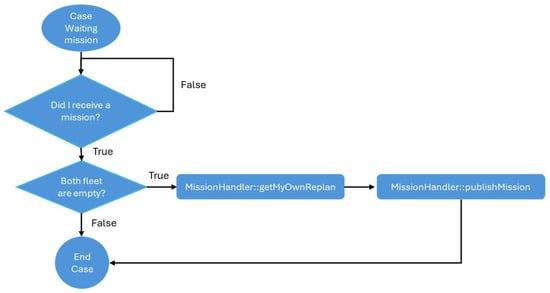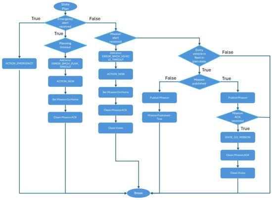 - STATE_PLAN: In this state, the mission is assigned to the mission module under the requirement that all vehicles in the newly formed fleet are in an identical state. Upon reaching the specified condition, it is necessary to have a confirmation message to execute a state transition. In the event of inadequate planning, an alert is triggered and the vehicle is removed from the fleet, returning to its original place. To avoid the state machine from becoming unresponsive, an event is generated when it remains in that state for an extended period. A timer triggers this event and instructs the vehicle to cease floating and return to its home location.