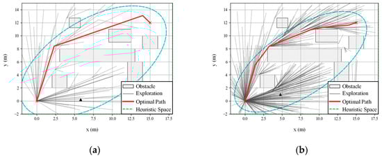 12]. Despite these improvements, RRT* still relies on global random sampling, which entails significant computational overhead for frequent neighbor searches and collision checks. Moreover, the probability of identifying globally optimal solutions remains relatively low in complex environments. To further enhance search efficiency and optimality, the Informed-RRT* algorithm was developed, which introduced a dynamically constrained search space [