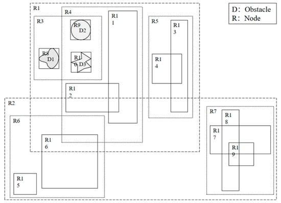 STRTree is an efficient spatial index structure for collision detection. During preprocessing, each obstacle is assigned a minimum bounding rectangle (MBR). These MBRs are then grouped, sorted, partitioned by spatial proximity, and hierarchically aggregated from the bottom up. In STRTree, leaf nodes store actual obstacles and are located at the base of the tree. Non-leaf nodes store only collections of child node MBRs and pointers, not actual obstacle information, and are located exclusively in upper tree levels [