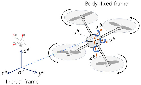 As depicted in Figure 1, the quadrotor configuration features mass m and diagonal inertia tensor . Define the state variables as . The position of the quadrotor in the world coordinate system is defined as . Quaternions are selected to represent the attitude of the quadrotor. The linear velocity of the quadrotor in the world coordinate system, , and the angular velocity around the X-, Y-, and Z-axes in the body coordinate system, , are defined. The thrust is taken as the input of the nonlinear system dynamics equation.
