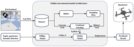 where denotes the continual learning loss, represents the online dataset, comprises model parameters updated through CBP, and contains quadrotor state variables and input data acquired from the simulation environment. The online learning process continuously updates using streaming data.