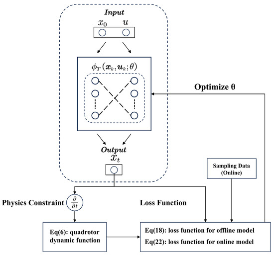 Nevertheless, current data-driven models exhibit inherent limitations in achieving state detection capability without prior data samples, particularly with the challenge of initial state estimation in environments lacking operational prior knowledge. Hybrid physics-data integrated models have gained significant research momentum due to their synergistic advantages [13,14]. Physics-informed neural networks (PINNs), as a representative architecture combining physical principles with data-driven learning, utilize automatic differentiation to incorporate physical constraints into neural network optimization. This methodology has found broad applications across fluid dynamics [15,16], robotics [17,18,19], and optimal control [20,21]. Gu et al. enhanced model interpretability through PINNs-based physical-law embedding and visualization techniques for behavioral analysis [22]. Bianchi et al. demonstrated PINNs’ superiority over extended Kalman filters in both solution validity and computational efficiency for quadrotor dynamic model estimation [23]. Sanyal et al. proposed a robust adaptive MPC framework employing physics-informed loss functions to learn ideal dynamics models, thereby improving robustness against parametric uncertainties [24].