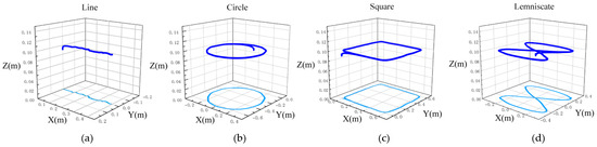 To collect external disturbance data of the quadrotor and verify the effectiveness of the proposed method, this paper employs the multi-rotor quadrotor environment based on the PyBullet physics engine from [34]. The quadrotor selected is the Crazyflie 2.0, with parameters shown in Table 2. We choose a PyBullet simulation frequency of 240 Hz and a quadrotor simulation frequency of 48 Hz. Data of the quadrotor straight-line, circular, square, and lemniscate trajectories are collected as experimental data, as shown in Figure 5, and the dark blue line represents the flight trajectory of the quadrotor, while the light blue line indicates the projection of the quadrotor’s trajectory onto the XOY plane. A total of 2300 data points were collected for the online model dataset.
