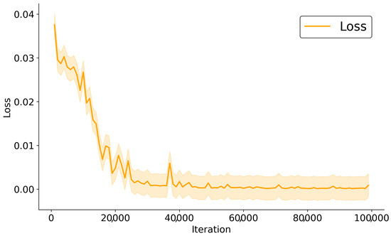 The training data for the offline model is based on the quadrotor state data collected from the simulation environment. The state variables of the quadrotor at the next moment, , are calculated through (9). We randomly select 500 sample points from the dataset, , and set the learning rate to for the offline model training. After 100,000 iterations, the model is able to achieve a loss level of , as shown in Figure 6. It can be observed from Figure 6 that even after convergence, there is still a sudden change in the model loss. This is because the use of the CBP method endows the model with greater plasticity.