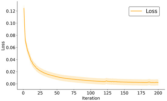 Figure 9 illustrates the variation of the loss function with the number of iterations during the online continual learning process. As the number of iterations increases, the loss function gradually converges. After 200 iterations, the model was able to achieve a loss level of . This indicates that during the online continual learning process, the model’s loss decreases with increasing iterations, and the model’s performance is continuously optimized and improved. It can be seen from Figure 9 that as the number of iterations increases, the value of the loss function gradually decreases and stabilizes. As the iterations proceed, the model gradually adapts to the new data distribution, and the loss function value significantly decreases, indicating that the model’s prediction of the quadrotor state becomes increasingly accurate. Through the CBP algorithm, the model can update its parameters in real-time, adapt to complex wind resistance disturbances, and thus improve the accuracy and robustness of the quadrotor state estimation.