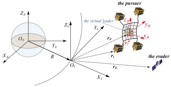 The orbital movement of the spacecraft in the OPEG scenario are represented by defining several coordinate systems based on the earth-centered inertial (ECI) frame, labeled as , which is positioned at the center of the Earth. The relative dynamics between the orbital pursuer and the evader are analyzed in the Euler-Hill coordinate frame. This frame, labeled as , is defined with the -axis pointing radially outward, the -axis aligned with the angular momentum vector, and the -axis completing the right-handed orthogonal coordinate system. To describe the attitude of the tethered net, the body-fixed frame, denoted by , is defined and located at the virtual leader. The -axis aligns with the direction of the virtual leader’s velocity, the -axis is parallel to the plane, and the -axis is defined to form a right-handed orthogonal coordinate system. In the Euler–Hill coordinate frame, the spacecraft’s relative translational dynamics are governed by the following equations: