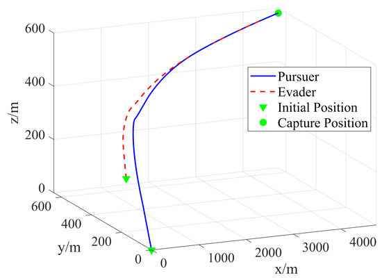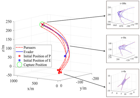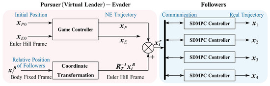 The game theory-based virtual leader–follower tracking control framework is shown in Figure 2. Based on initial conditions and the game control strategy, both the virtual leader (the pursuer) and the evader can follow their ideal NE trajectories. Then, using the distributed formation tracking control, the followers with a tethered net can track their formation trajectory under the uncertainty of tethered net dynamics and safety constraints.