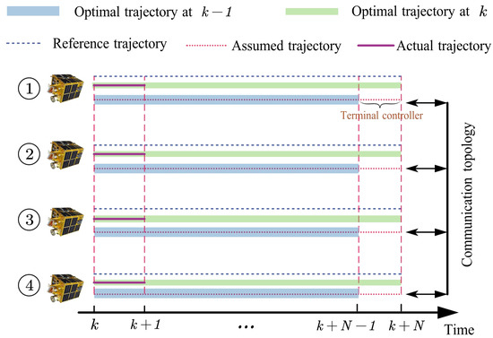In this work, SDMPC is employed to facilitate formation tracking while ensuring compliance with critical constraints and mitigating the effects of disturbances caused by the tethered net. These constraints not only involve maintaining safe inter-spacecraft distances above, but also require that the gap between the actual trajectories and the assumed trajectories communicated to other agents remains within acceptable bounds. The assumed trajectories are defined as the combination of the optimal trajectories computed at the previous time step and the terminal control input applied to the final state, as shown in Equation (40). The computational schematic of the SDMPC method is illustrated in Figure 4. At kth time step, each spacecraft optimizes its trajectory at the kth time step based on the reference trajectory , the optimized trajectory from the th time step, and the assumed trajectories of its neighboring spacecraft. The corresponding notations for control and state variables are summarized in Table 1. The first segment of the optimized control for each follower is chosen as the actual input at kth time step, and then the actual next state is determined.