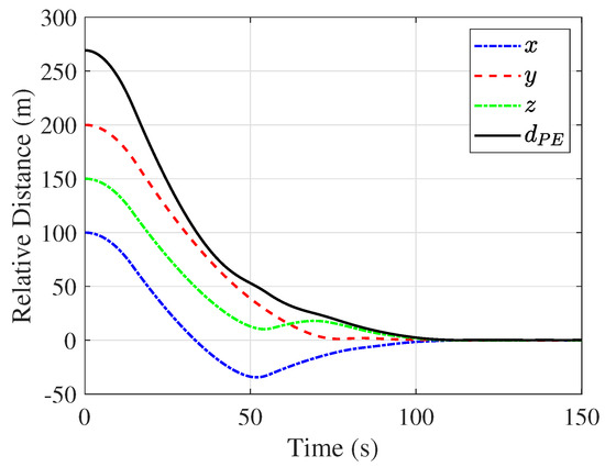 In this work, based on the initial condition , the simulation results of the OPEG are presented in Figure 5, Figure 6, Figure 7, Figure 8, Figure 9, Figure 10, Figure 11, Figure 12, Figure 13 and Figure 14. Specifically, Figure 5 illustrates the NE trajectories of both spacecraft, while Figure 6 depicts the evolution of the distance between them. From these figures, it can be observed that the evader attempts to escape, whereas the virtual leader actively minimizes the distance . Due to its higher acceleration capability, the virtual leader gradually closes their gap over time and captures the evader. Figure 7 illustrates the convergence behavior of the neural network weights, which eventually stabilize at specific values as follows: