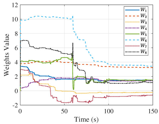 where denotes the ideal constant weight vector, is a vector of manually designed basis functions that act as neuron nodes, and represents the approximation error of the neural network. Then, the gradient form of is given as follows: