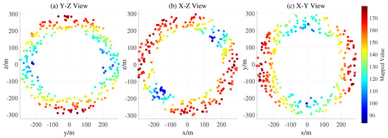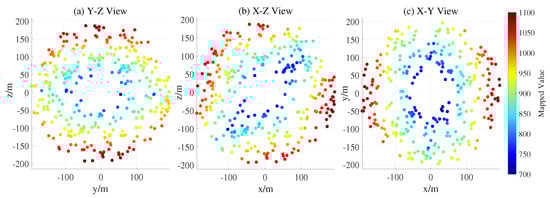 The weight convergence condition is defined based on the infinity norm of the difference between two consecutive weight vectors. Specifically, the training is considered to have converged when . The NE control can be obtained for both virtual leader and evader by substituting the converged weights into Equation (18). Based on this control strategy, we conducted 600 randomized simulations to investigate how the relative initial positions between the evader and the virtual leader influence the capture outcome. The evader’s initial positions are sampled in the YZ, XZ, and XY planes that pass through the origin. Under this NE control policy, all simulations resulted in successful capture within 100 s. Moreover, the control effort required by the virtual leader is generally positively correlated with the initial distance to the evader, as illustrated in Figure 8. To further evaluate the generalization ability of the NE control policy, we expand the sampling region of the evader’s initial positions to an unseen area and conduct another 600 randomized simulations. The results are shown in Figure 9, where red crosses denote evader initial positions that were not captured within 300 s, and the color of each point indicates the required capture time. A success rate of 95.16% is achieved in the unseen region, demonstrating the generalization capability of the proposed NE control policy.