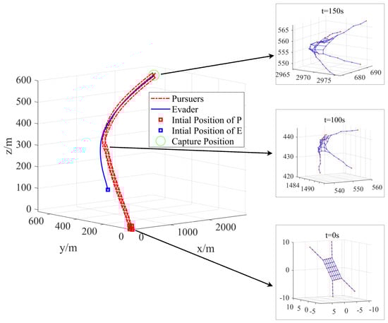 To ensure the generalizability of the results, 600 Monte Carlo simulation runs were conducted with randomized initial positions of the evader during the pursuit–evasion phase. Figure 15 presents the trajectory and formation configuration of the TSNR system under SDMPC-based tracking, corresponding to the initial condition . This Monte Carlo simulation also provided sufficient data to support a statistical comparison of performance metrics across different formation tracking methods. The performance metrics include control effort, maximum formation deviation, and formation error convergence time. Specifically, control effort represents the energy cost of control; maximum formation deviation denotes the largest error in the distance between adjacent spacecraft compared to the desired spacing; and formation error convergence time refers to the time required for the maximum formation deviation to fall below 0.5 m. As shown in Table 3, the proposed SDMPC method controls formation errors more effectively while also achieving lower control effort consumption.