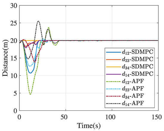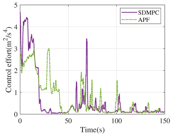 To further demonstrate the advantages of the proposed SDMPC approach, a comparative analysis is conducted against the APF method, a widely acknowledged state-of-the-art technique in formation tracking applications [7]. As shown in Figure 13, the real-time lengths of the formation edges are illustrated, demonstrating that the proposed SDMPC approach achieves the desired formation more quickly and effectively mitigates overshoot caused by the dynamics of the tethered net. Additionally, Figure 14 presents the control effort of the follower spacecraft under both methods; the total control effort consumed by SDMPC is 938.26 , compared to 1060.04 by APF.