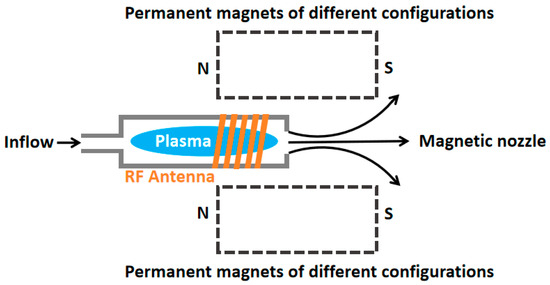 With the breakthroughs in miniaturized and modular electric propulsion technology, the large-scale application prospects of ultra-low orbit satellites in constellation networking, real-time remote sensing, and other fields are gradually becoming clear. In commercial space missions, the most commonly used micro-thrusters are Hall thrusters, such as the Space X Low Earth Orbit communication constellation, followed by ion thrusters, which have been widely applied in geosynchronous orbit, deep space exploration and other tasks [3,4,5,6,7,8,9,10,11]. Although Hall thrusters and ion thrusters have advantages, such as high specific impulse and large thrust, their system complexity and design cost significantly restrict their application in micro satellite platforms and commercial aerospace. These two types of electric propulsion systems not only require the installation of dedicated neutralizers to eliminate the charge accumulation of ion plumes, but also rely on complex electronic systems. This multi-subsystem integration architecture leads to a relatively large thruster size, low reliability and high single-unit cost. For commercial space missions that emphasize low cost and high reliability (such as the deployment of constellation satellites), these technical and economic characteristics have seriously affected their market applicability. Among them, radio frequency plasma has attracted increasing attention due to its advantages such as high density, no electrodes, fewer design structures and more operation modes [12,13,14,15]. The magnetic nozzle, as the core structure of the radio frequency plasma thruster, has attracted many research groups to join the research one after another since 2020. Sekine et al. from the University of Tokyo began to study the magnetic nozzles of thrusters in the inductive coupling discharge mode [16,17]. Kim et al. from Seoul National University, South Korea [18], Vinci et al. from the ICARE Laboratory of the French Academy of Sciences, Boni et al. from the French National Aerospace Laboratory [19,20] studied the thermodynamic processes of electrons in magnetic nozzles.