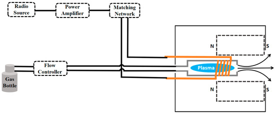 The RF plasma micro-thruster mainly consists of an RF coil (5 turns), a cylindrical quartz glass discharge chamber with a length of 30 mm and a diameter of 10 mm and a magnetic nozzle composed of samarium cobalt permanent magnets, as shown in Figure 1. Among them, the dotted box represents “groups of permanent magnets with different configurations”, which generate stable plasma based on the principle of inductive coupling self-sustaining discharge, and then accelerate the ejection of the plasma through the magnetic nozzle system.