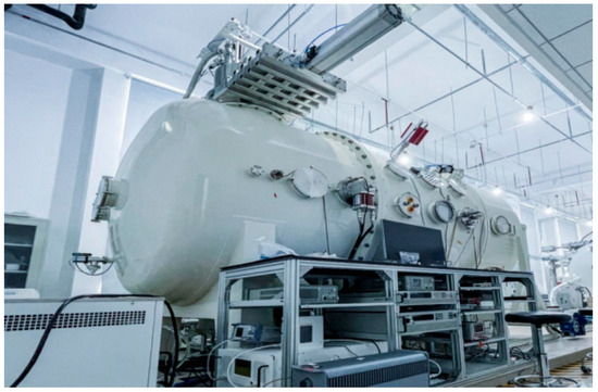 In the RPT-1 experiment conducted in this paper, the main experimental devices used include the ground simulation experiment platform for space vacuum environment (Figure 3) and the high-precision micro-thrust measurement equipment (Figure 4). The ground simulation experiment platform for the space vacuum environment can ensure that the vacuum degree reaches the level of 10−4 Pa before work and remains at the level of 10−3 Pa when the thruster is in operation. Its diameter is 1.8 m and the pumping speed is 32,000 L/s.