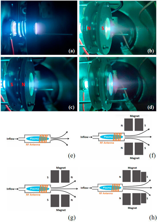 Plasma discharge diagram with different magnetic field configurations. (a) Plasma discharge without permanent magnet; (b) plasma discharge with two permanent magnets; (c) plasma discharge with permanent magnets of opposite polarity; (d) plasma discharge with three permanent magnets; (e–h) are, respectively, the schematic diagrams of (a–d).