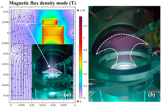 It can be seen that a mushroom-shaped plasma halo is generated at the outlet of the magnetic nozzle as Figure 5d. From the magnetic flux density model and magnetic field lines numerically simulated, it can be seen that this mushroom-shaped halo is due to some edge-charged particles being guided back to the outlet by the magnetic field lines, as shown in Figure 6a. To verify this view, we further increased the size of the peripheral permanent magnet, and a much larger mushroom-shaped plasma halo can be clearly observed, as shown in Figure 6b.