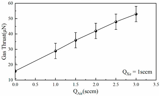 In the unignited state, when 1 sccm xenon gas (Xe) is introduced, the change in thrust with the addition of air flow is shown in Figure 7. It can be observed from the figure that when the air flow increases from 0 to 3 sccm, the thrust shows a linear change, and its order of magnitude is approximately tens of micro newtons. According to the data in the illustration, the aerodynamic force of 1 sccm xenon gas is approximately 16 μN, while that of 1 sccm air is approximately 13 μN.