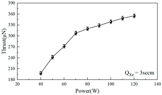 As can be seen from Figure 8, when the xenon gas flow rate is fixed at 3 sccm, the thrust increases with the increase of radio frequency power. At 40 W, the thrust can reach 200 μN, the specific impulse is 70 s and when the RF power reaches 120 W, the thrust reaches 360 μN, and the specific impulse is 125 s. When the RF power is less than 70 W, the growth slope of the thrust is relatively large, while when the RF power is greater than 70 W, and the growth slope of the thrust decreases. The reason for this phenomenon lies in that as the radio frequency power increases, the ionization process of the plasma approaches saturation, and the thrust gain mainly comes from the aerodynamic force generated by electric heating, while the contribution of electromagnetic acceleration relatively decreases.