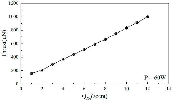 The relationship between the fixed RF power of 60 W, thrust and Xe flow rate when pure Xe is used.