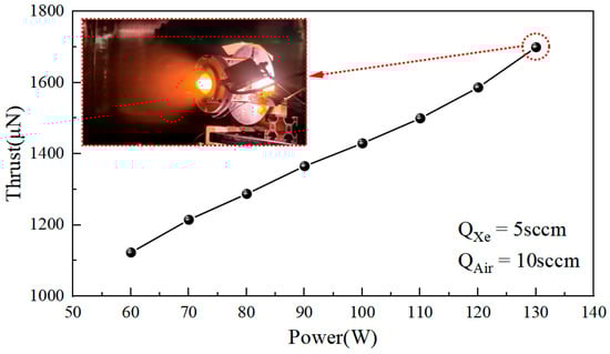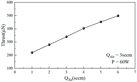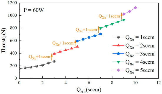 Under the condition of a fixed RF power of 60 W, air working medium was gradually added to explore the changes in thrust. The results are shown in Figure 10, where the xenon (Xe) flow rate is fixed at 1 to 5 sccm and air is added at a step of 0.5 sccm. To more intuitively demonstrate the influence of changes in air flow rate and xenon gas flow rate on thrust, the air flow rate in the figure is continuously increasing rather than starting from 0 sccm. It can be observed that, under the condition of a fixed xenon gas flow rate, the thrust increases linearly with the increase of air flow rate. For every 0.5 sccm increase in air, the thrust approximately increases by 30 μN. When the xenon gas flow rate is increased, the increase in thrust is even greater. For every 1 sccm increase in xenon gas flow rate, the thrust increases by approximately 100 μN. When the Xe flow rate is 5 sccm and the air flow rate is 10 sccm, the thrust reaches 1123 μN, the specific impulse is 145 s.