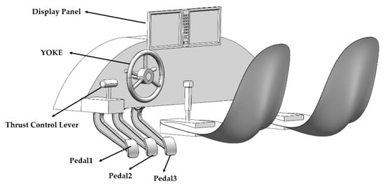 The cockpit design in this study draws extensively from existing aircraft designs, incorporating elements that are well-established in the aviation industry, as shown in Figure 4 and Figure 5. This ensures that the HMI is intuitive and adaptable to the specific requirements of both flight and ground modes. The system is designed to be flexible, with the cockpit interface balancing the need for complex flight controls and the simpler operational demands of ground driving. As a result, the pilot’s adaptation process is relatively short, reducing the learning curve and easing the transition between modes.