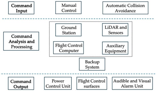 As shown in Figure 9, the landing control unit consists of three main parts—Command Input, Command Analysis and Processing, and Command Output—with a backup system included in the Command Analysis and Processing part as a redundancy [23,24]. These three parts correspond to the three intermediate events in the first level of the fault tree, and subsequent middle- and lower-level failure events can be further branched from this.