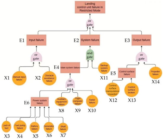 Based on the structure of the landing control unit in Figure 9, a fault tree is constructed for the landing control unit, as shown in Figure 10. The fault tree for the backup system failure is shown in Figure 11.