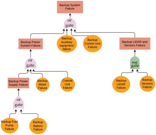 Any failure in “Backup Power System, Backup Auxiliary Equipment, Backup Control Unit, Backup LiDAR and Sensors“ could lead to a Backup System failure, so these four factors are treated as intermediate events in the first layer of the fault tree and are transmitted to the top event via an OR gate. For the Backup Power System, any event occurring that leads to Backup Power Supply failure, Backup Motor failure, or Coaxial Unit failure will lead to Backup Power System failure, so OR gates are used to connect them.