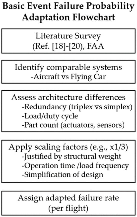 There is a stepwise adaptation workflow in Figure 12 that converts failure data from the literature into probabilities applicable to the flying car context. This process includes the following: