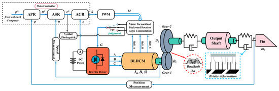 EMA is a kind of nonlinear servo system composed of a main controller, an inverter driver, a logic commutation module, a BLDCM, a gear reducer, an output shaft and a control fin. This section mainly starts from three nonlinear aspects: BLDCM, gear backlash, and friction nonlinearity. A dynamic model of EMA system is established and its dynamic characteristics are analyzed in this section, and its topology is shown in Figure 1 below.