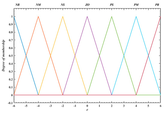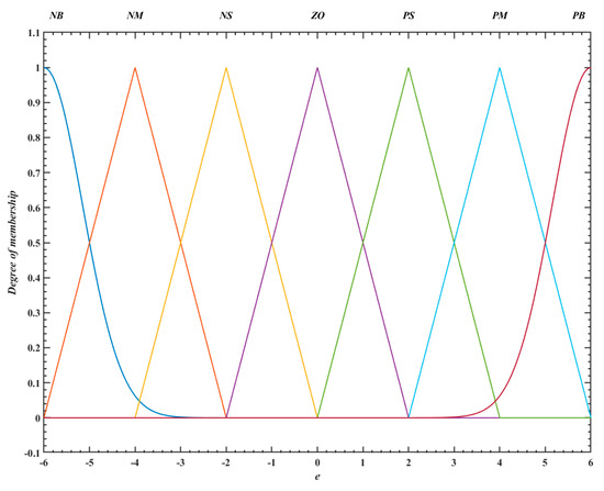 Fuzzy control does not require quantitative mathematical modeling of the controlled process, but attempts to acquire knowledge from experts, that is, expert behavior and experience. Multi-input and multi-output fuzzy controllers usually include five parts: fuzzification, database, rules, inference, and defuzzification. Firstly, the fuzzy controller designed in this paper takes position error e and error change rate ec = de/dt as the inputs of the fuzzy controller, and the weight coefficients ΔKp, ΔKi, and ΔKd as the outputs. The domain range of input and output variables are set to [−6, 6] and the quantization level is 13, that is, [−6, −5, −4, −3, −2, −1, 0, 1, 2, 3, 4, 5, 6]. This variable configuration can enhance computational efficiency without compromising calculation accuracy. Secondly, the database contains various parameters related to fuzzy data processing. The fuzzy subsets of input and output variables are defined as seven fuzzy language values, namely NB (Negative Big), NM (Negative Middle), NS (Negative Small), ZO (Zero), PS (Positive Small), PM (Positive Middle), and PB (Positive Big), respectively. Figure 5 below shows the membership function of the input variable e of F-PID algorithm, which is a “triangle” function, and the other variables are the same.