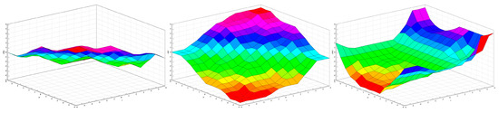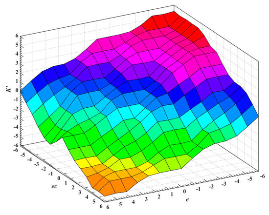 Then, fuzzy rules are established based on control engineering knowledge and experts’ experience, as shown in Table 3 below. For example, when both the e and ec are classified as NB, the system typically exhibits a slower response speed and a large steady-state error. Therefore, assigning the Kp as PB can accelerate the system response, reduce the rise time and steady-state error. However, a shorter rise time may lead to a larger overshoot. Setting the Ki as NB can significantly reduce the overshoot and settling time. Assigning the Kd as PS can slightly reduce the rise time, overshoot, and settling time, thereby enhancing system stability. Similarly, the design logic for the other fuzzy rules can be derived. In addition, Figure 6 shows the fuzzy rules surface.