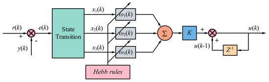The input of state converter reflects the state of the controlled object and control settings in Figure 7, and the output is the state variable required for neuron learning control. The control signal u(k) is generated by neurons through association search and self-learning. The system input r(k) and output y(k), which are the required state quantities x1(k), x2(k), and x3(k) for neuron learning after state transition, is set. K is the proportional gain coefficient, with K > 0. The output u(k) of SN-PID controller can be expressed as