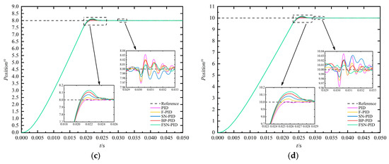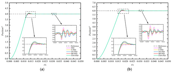 In this section, the step position response effect of EMA under the setting position of 4°, 6°, 8°, and 10°, respectively, is investigated by combining the actual flight attitude of GP and the motion state of EMA system, and an external sudden disturbance torque of 2 N·m is applied at 0.03 s, as shown in Figure 12 below. Firstly, this section compares the fin position response capability of APR using PID, F-PID, SN-PID, BP-PID, and FSN-PID algorithm for EMA system, respectively, and analyzes the time-domain response performance under 6° position. The specific values are given in Table 4 below.