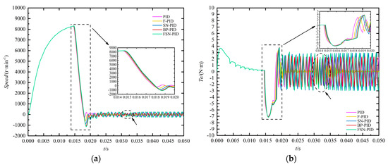 It can be concluded from Table 4 and Figure 12b that the FSN-PID algorithm has a shorter rise time tr, about 16.761 ms, which can be reduced by about 4.561% compared to PID, about 1.954% compared to F-PID, about 0.875% compared to SN-PID, and about 0.380% compared to BP-PID, but the peak time tp and overshoot σ are relatively large. The steady-state error of F-PID algorithm is the smallest, which is about 0.00044°. Furthermore, compared to the SN-PID algorithm, the BP-PID algorithm exhibits a shorter tr and smaller steady-state error, which demonstrates the superiority of multi-layer, multi-neuron network structure. Moreover, as shown in Figure 12, under the sudden load disturbance applied at 0.03 s, the FSN-PID controller exhibits faster response speed, smaller steady-state error, and stronger disturbance rejection capability and robustness compared to the other algorithms. In summary, the FSN-PID algorithm has a shorter response time and greater robustness, while the F-PID algorithm has a smaller overshoot and steady-state error, but a relatively longer rise time.