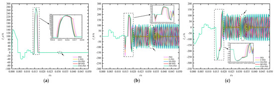 In addition, similar to the response of fin position, the variation patterns of EMA and its various electrical characteristics under different algorithms can be obtained from Figure 13, Figure 14 and Figure 15. Among them, the FSN-PID algorithm has a faster response speed and a more stable electrical mutation trend, while the F-PID algorithm has a smaller steady-state error. The BP-PID algorithm has a faster response speed than the SN-PID algorithm. Although SN-PID algorithm has a shorter response time than F-PID algorithm, the steady-state error is larger.