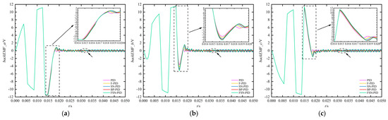 Moreover, this section takes the reference position of 6° as an example to analyze and compare the dynamic characteristics of BLDCM during the motion of EMA under different controllers, including speed, electromagnetic torque, three-phase current, and back EMF. It can be concluded from Figure 13, Figure 14 and Figure 15 that when the motor starts moving with EMA, the instantaneous speed and back EMF are both zero, and the armature current at this time can be expressed as