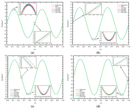 During the actual flight process of GP, the onboard computer calculates its flight attitude in real time and sends commands to EMA system, and the fin position moves in a sine signal with the same frequency as the rolling of GP. Therefore, this section simulates the tracking effect of EMA system using different algorithms for sine position under the condition of fin position motion frequency of 2 Hz, amplitude of 4°, 6°, 8°, and 10°, as shown in Figure 16. It also can be concluded that the FSN-PID algorithm has a faster response speed, similar to step position response.