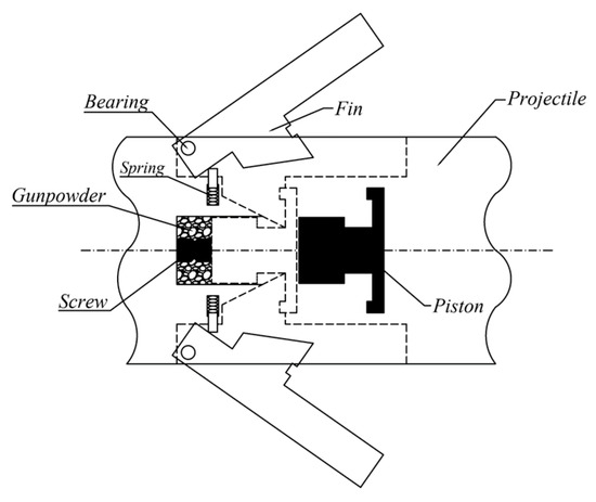 In general, wind tunnel experiments are primarily employed to investigate aerodynamic characteristics [38]. In this section, a wind tunnel experiment was conducted to simulate the high-dynamic flight environment of GP, analyzing its aerodynamic characteristics and the real-time tracking accuracy of EMA system utilizing the FSN-PID controller. Figure 17 below shows the schematic diagram of fin opening instantaneous action as the initial zero time (t = 0 ms). At this time, the onboard computer sends a fin extension command to EMA, outputs a large current to ignite the gunpowder and produces a large amount of gas, causing the pressure in the chamber to rapidly increase, pull off the locking screw, and the piston moves forward under the pressure. Finally, the spring pushes fin to unlock, and the EMA system is ready to work.
