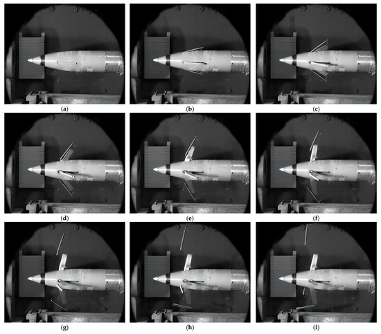 Instantaneous action of fin opening. (a) 0 ms; (b) 2 ms; (c) 4 ms; (d) 6 ms; (e) 8 ms; (f) 10 ms; (g) 12 ms; (h) 14 ms; (i) 16 ms.