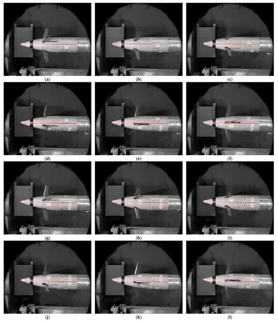 Experimental diagram of projectile rolling with sine fin position. (a) 15,000 ms; (b) 15,012 ms; (c) 15,024 ms; (d) 15,036 ms; (e) 15,048 ms; (f) 15,060 ms; (g) 15,072 ms; (h) 15,084 ms; (i) 15,096 ms; (j) 15,108 ms; (k) 15,120 ms; (l) 15,132 ms.