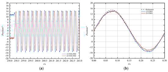 Figure 21a below is the fin position curve of the EMA corresponding to Figure 20 using the FSN-PID algorithm. It can be concluded from Figure 21a that in order to obtain a better aerodynamic torque for GP, the fin position amplitude of the 1# and 2# EMAs are the same, but with a 90° phase difference. In Figure 21b, the fin position curves of 1# and 2# EMAs are integrated into the same coordinate system, and the tracking effect within one cycle is analyzed specifically.