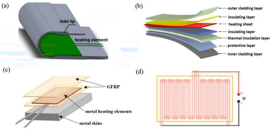 Structure of the integrated electrothermal anti-icing functional components. (a) Conventional adhesive-bonded structure; (b) integrated anti-/de-icing functional structure; (c) heating layer encapsulation process; and (d) schematic diagram of the heating element.