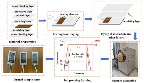 The co-curing process utilized in this study represents an integrated technique that concurrently hot-press forms both the functional layers (e.g., metal heating elements) and structural matrix (e.g., glass fiber reinforced composites) within a single curing cycle. This method offers the significant advantage of eliminating the adhesive layer typically required in conventional secondary bonding, thereby reducing weight by 20–35%. By exerting precise control over pressure and temperature during the hot-pressing process, the formation of internal defects such as voids during resin curing is effectively mitigated. The manufacturing process for the integrated functional–structural anti-icing/de-icing component using co-curing technology, as depicted in Figure 2, involves three distinct stages: the pretreatment stage, the lay-up process stage, and the curing formation stage. The specific fabrication sequence is as follows: