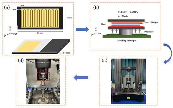 Interlaminar strength testing by the short-beam method. (a) Dimensions of the heating film; (b) schematic of the hot-press curing process; (c) test equipment configuration; and (d) specimen bending test. In (d), the red rectangular area represents the test sample, and the blue arrows indicate the test steps.