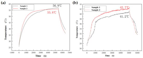 The experiments were conducted utilizing a multifunctional data acquisition instrument (model M300, produced by RIGOL Co., Suzhou, Jiangsu Province, China) to assess the temperature-rise curves on both the inner and outer surfaces of Samples 1 and 2, as illustrated in Figure 4. The experimental data presented in Figure 4a,b indicate that Sample 2 exhibits enhanced electrothermal performance: the heating rate increased by 49% (from 0.51 to 0.76 °C/min), electrothermal efficiency improved by 4.8%, and power consumption decreased by 7%. Additionally, temperature heating uniformity improved by 38%. In Sample 1, the heating layer was bonded to the matrix, resulting in localized poor contact that induced interfacial thermal resistance and compromised heating uniformity. In contrast, Sample 2 possesses an integrated structure that minimizes interfacial thermal resistance, thereby enabling more continuous heat conduction pathways and promoting uniform heat diffusion.