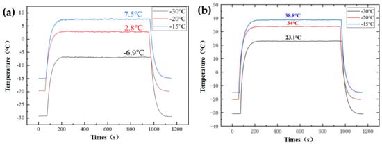 Low-temperature dynamic electrothermal performance. (a) Heating curve of low-temperature Sample 1. (b) Heating curve of low-temperature Sample 2.